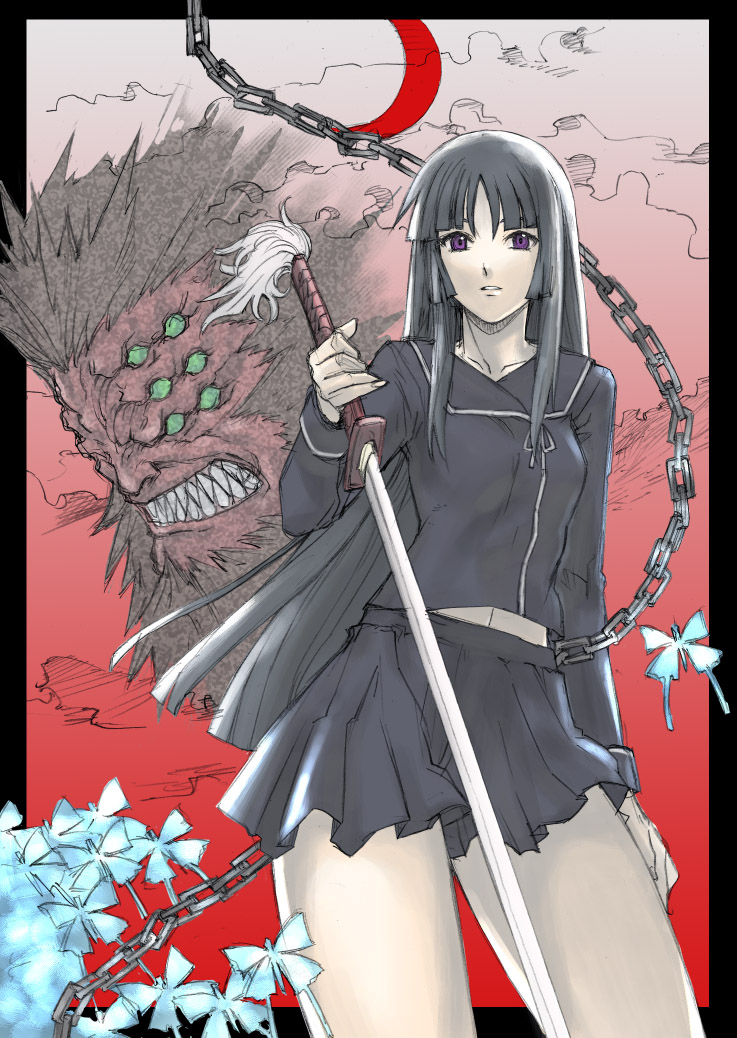 haruyama kazunori, kawai iko, chikyuu bouei shoujo iko-chan, 1girl, boots, breasts, brown eyes, brown hair, dot nose, female focus, gloves, headset, large breasts, long hair, long sleeves, looking at viewer, matching hair/eyes, open mouth, outdoors, panties, pantyshot, salute, skirt, sky, smile, socks, solo, thighs, underwear, upskirt, very long hair, white skirt, white socks