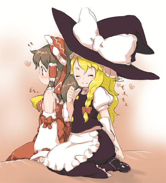 2girlsbedblonde hairblushbraidbrown haircoupledetached sleevesfemale focushatheartjapanese clotheslong hairmikomultiple girlssmilewitchwitch hatyuri