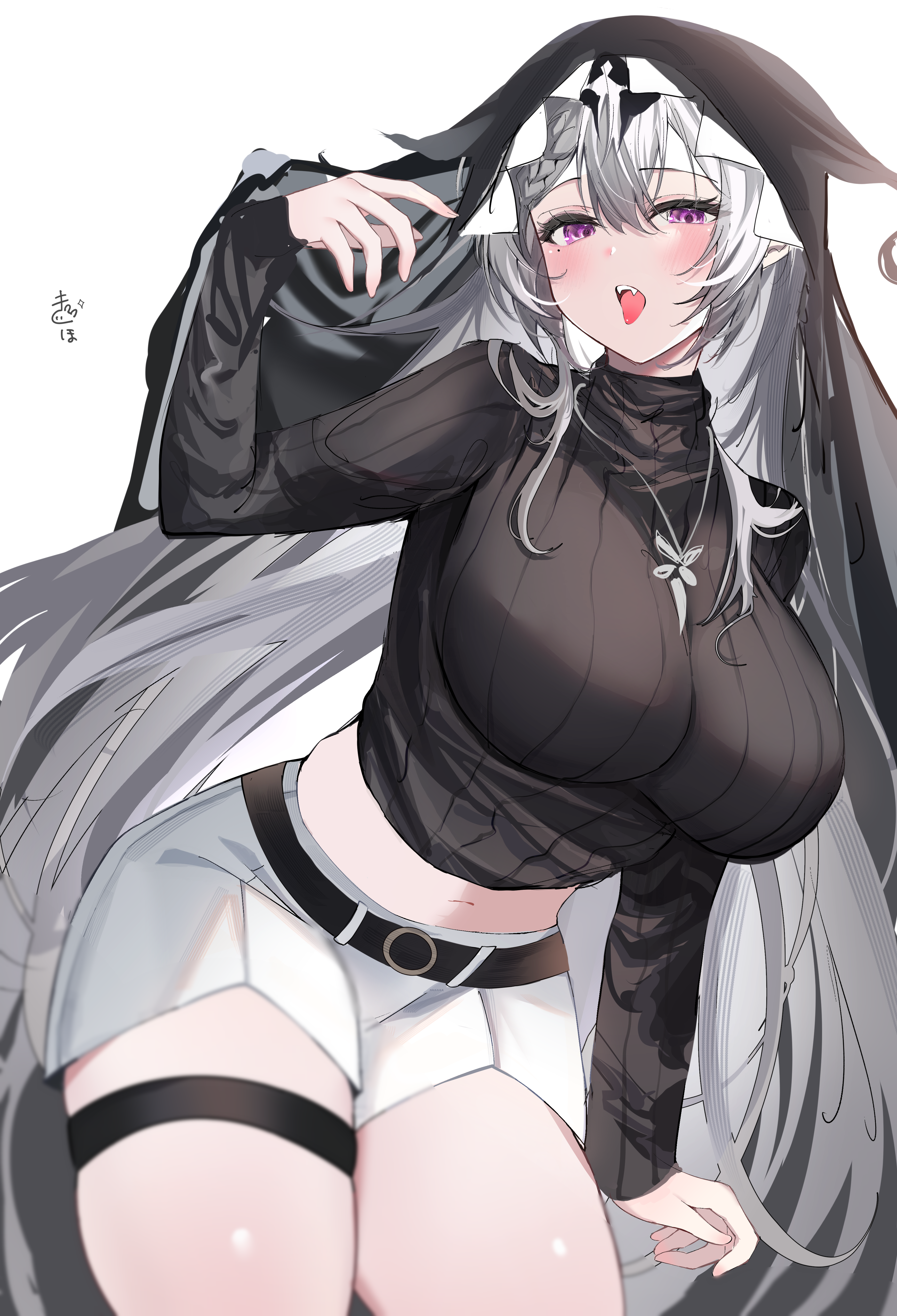 1girlalternate costumebeltblack beltblack sweaterbreastsgrey hairhuge breastslong hairlong sleeveslooking at viewermolemole under eyeopen mouthpurple eyesshortssimple backgroundsolosweaterthigh straptonguetongue outwhite backgroundwhite shorts