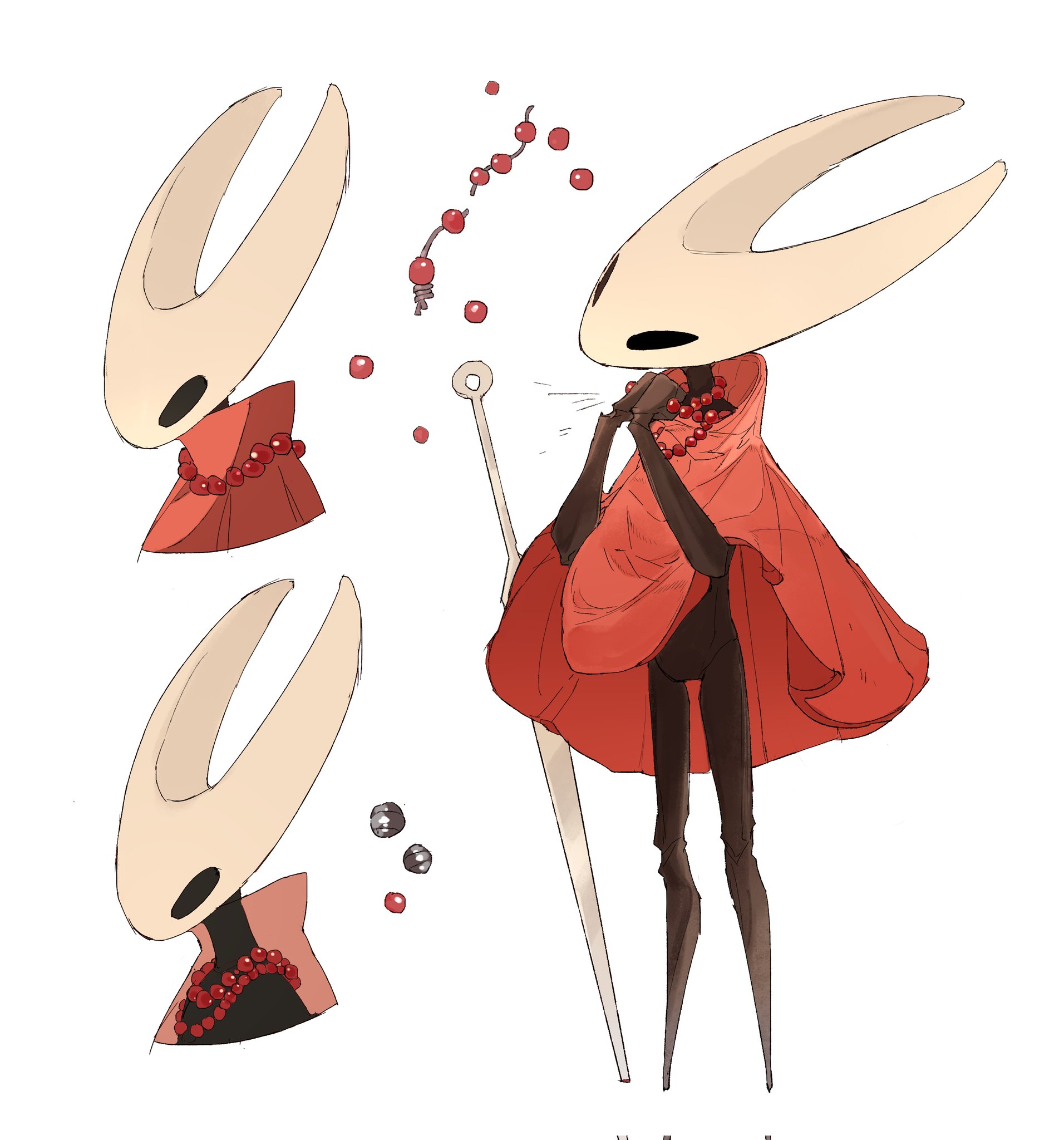 1girlarthropod girlbead necklacebeadsblack skincloakcolored skinfull bodyhollow eyeshorned maskjewelrymaskmultiple viewsnecklaceneedle (hollow knight)no humansno mouthred cloaksimple backgroundstandingweaponwhite backgroundwhite mask