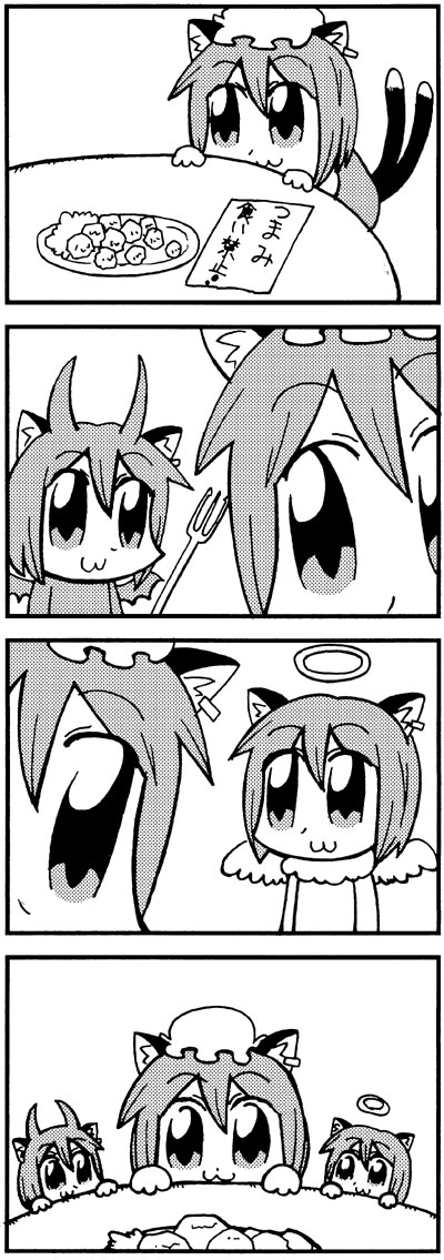 1girl4komaangelangel and devilangel wingsanimal earscat earscomicdemonfemale focusfoodgreyscalehalomonochromepolearmtraditional halotridentweaponwings