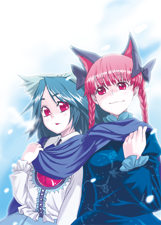 2girlsanimal earsblack hairbraidcat earscat girldressfemale focusgradient backgroundlong hairmultiple girlsoutdoorsred eyesred hairribbonscarfwhite background