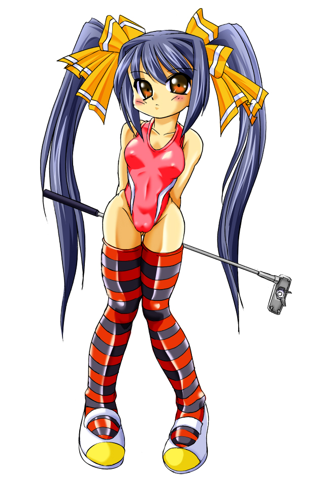 blue haircompetition swimsuitgolf clublong hairone-piece swimsuitred eyessoloswimsuitthighhighstwintails