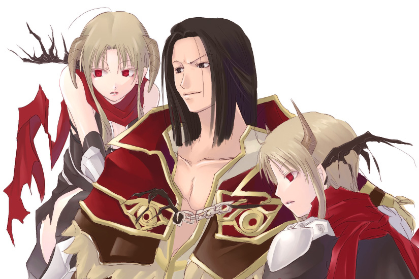 1girl2boysblack shirtblousecapedemon girlhornsmultiple boysred eyesscarfshirtsimple backgroundtorn capetorn clothestorn scarfwhite background