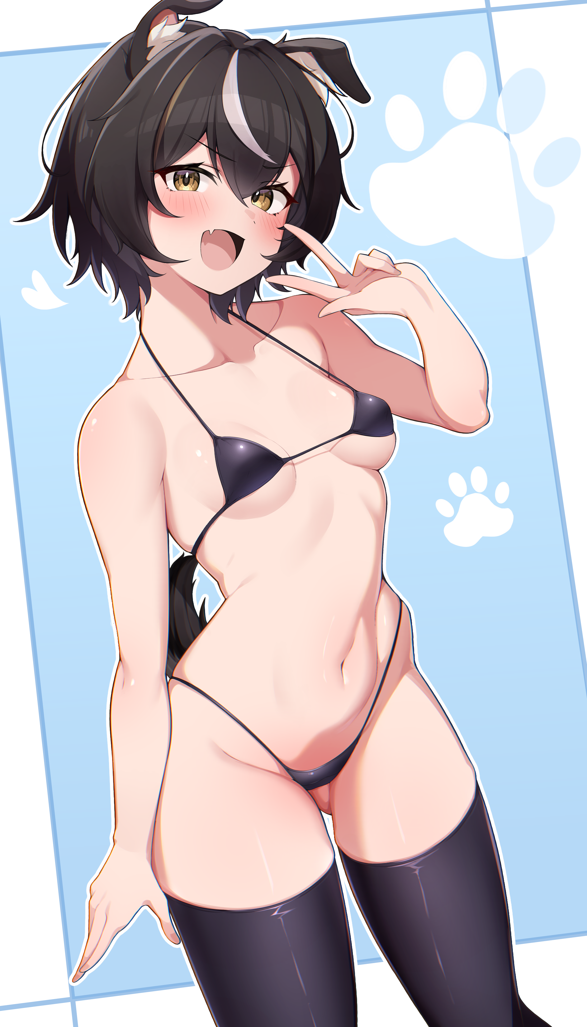 :d1girlanimal earsbikiniblack bikiniblack hairblack thighhighsblue backgroundblushbreastsdog earsdog girldog tailfanggluteal foldlooking at viewermulticolored hairnavelopen mouthshort hairsimple backgroundskin fangsmall breastssmilesolostreaked hairstring bikiniswimsuittailthighhighsvwhite hairyellow eyes