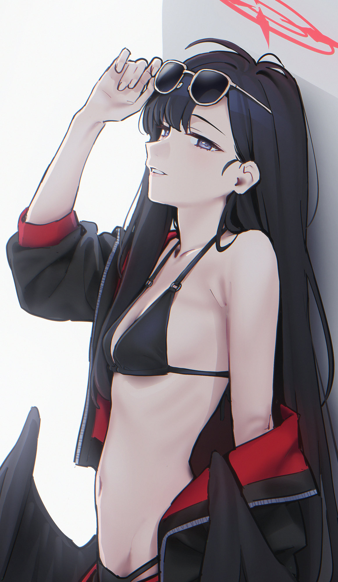 333 (dqqqdle), malina (helltaker), helltaker, highres, 1girl, alcohol, annoyed, black border, black horns, black nails, black tail, black vest, blush, border, bottle, breasts, demon girl, demon horns, demon tail, green background, hand in own hair, holding, holding bottle, horns, large breasts, looking at viewer, pantyhose, red eyes, red shirt, shirt, short hair, solo, tail, vest, vodka, waistcoat, white hair