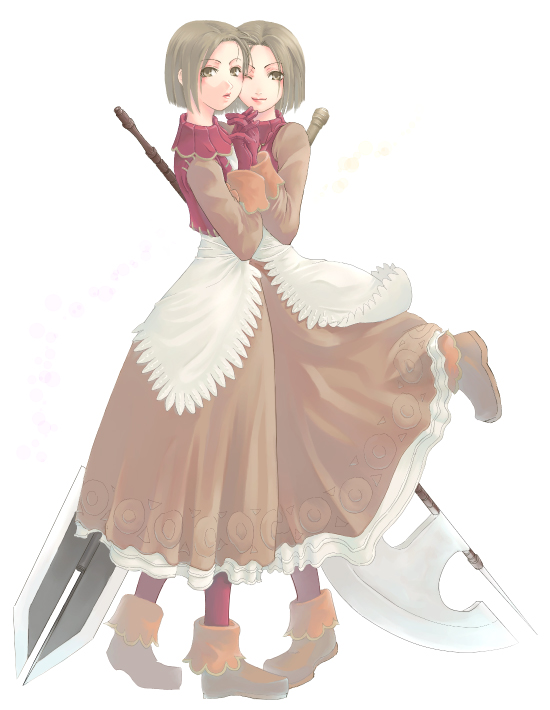hana, kaida michi, arin, cecilia, kooh, pangya, bad tag, 3girls, black hair, blonde hair, braid, hand on own hip, long hair, maid headdress, multiple girls, red hair, twintails, wink