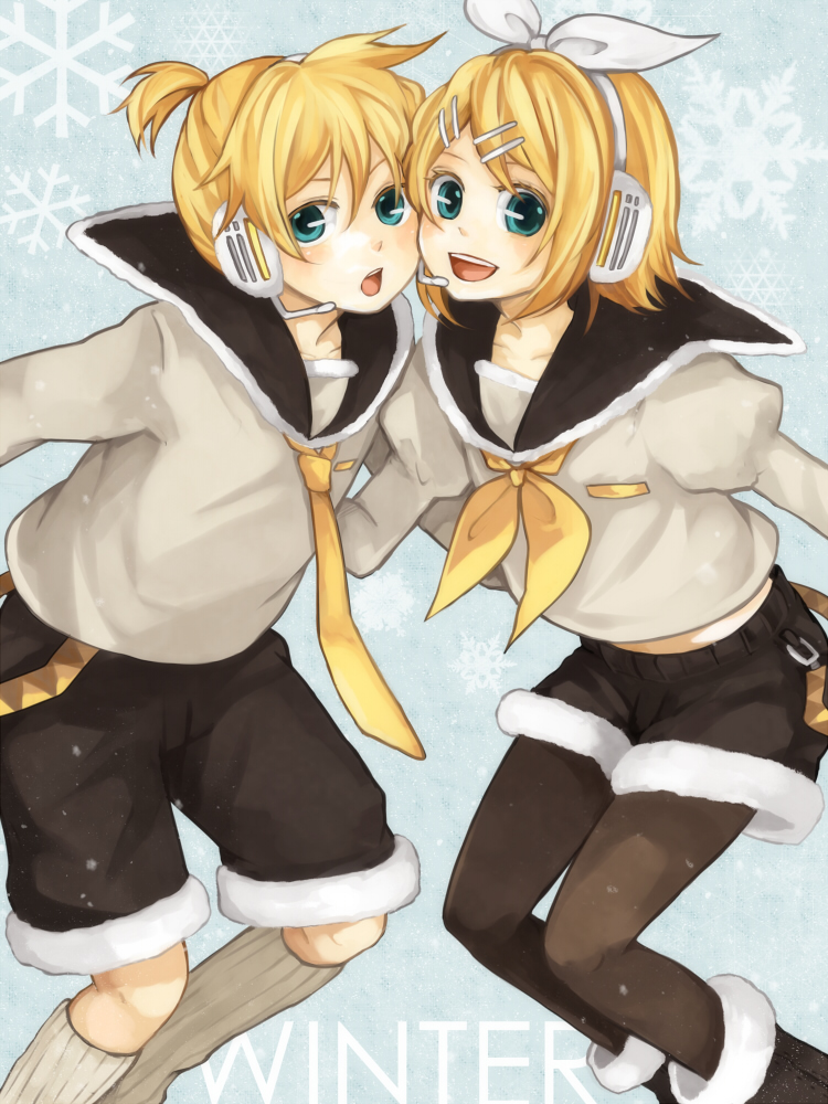 1boy1girlblonde hairblue eyesblushbrother and sistercheek-to-cheekhair ornamenthair ribbonhairclipheads togetherneckerchiefnecktiepantyhosepantyhose under shortsribbonshort hairshortssiblingstwinsyellow necktie