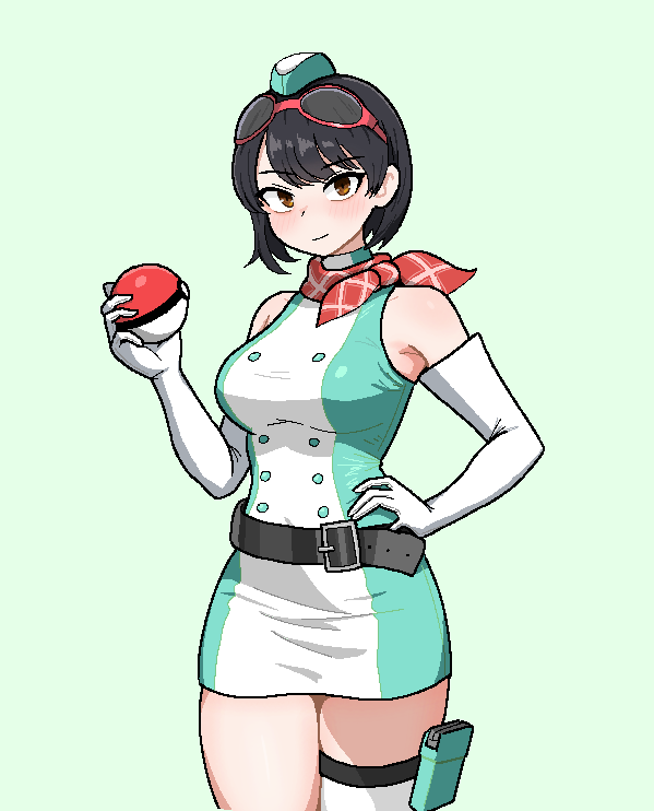 1girlbare shouldersbeltblack beltblack hairblushbreastsbuttonscellphoneclosed mouthcowboy shotdouble-breasteddresselbow glovesflip phoneglovesgogglesgoggles on headgreen dressgreen hathand on own hiphatholdingholding poke balllarge breastsmicrodressphonepoke ballpoke ball (basic)pouchred eyesred scarfscarfshort hairsimple backgroundsingle thighhighsleevelesssleeveless dresssolothigh pouchthigh strapthighhighsthighstwo-tone dresswhite backgroundwhite dresswhite gloveswhite thighhighs