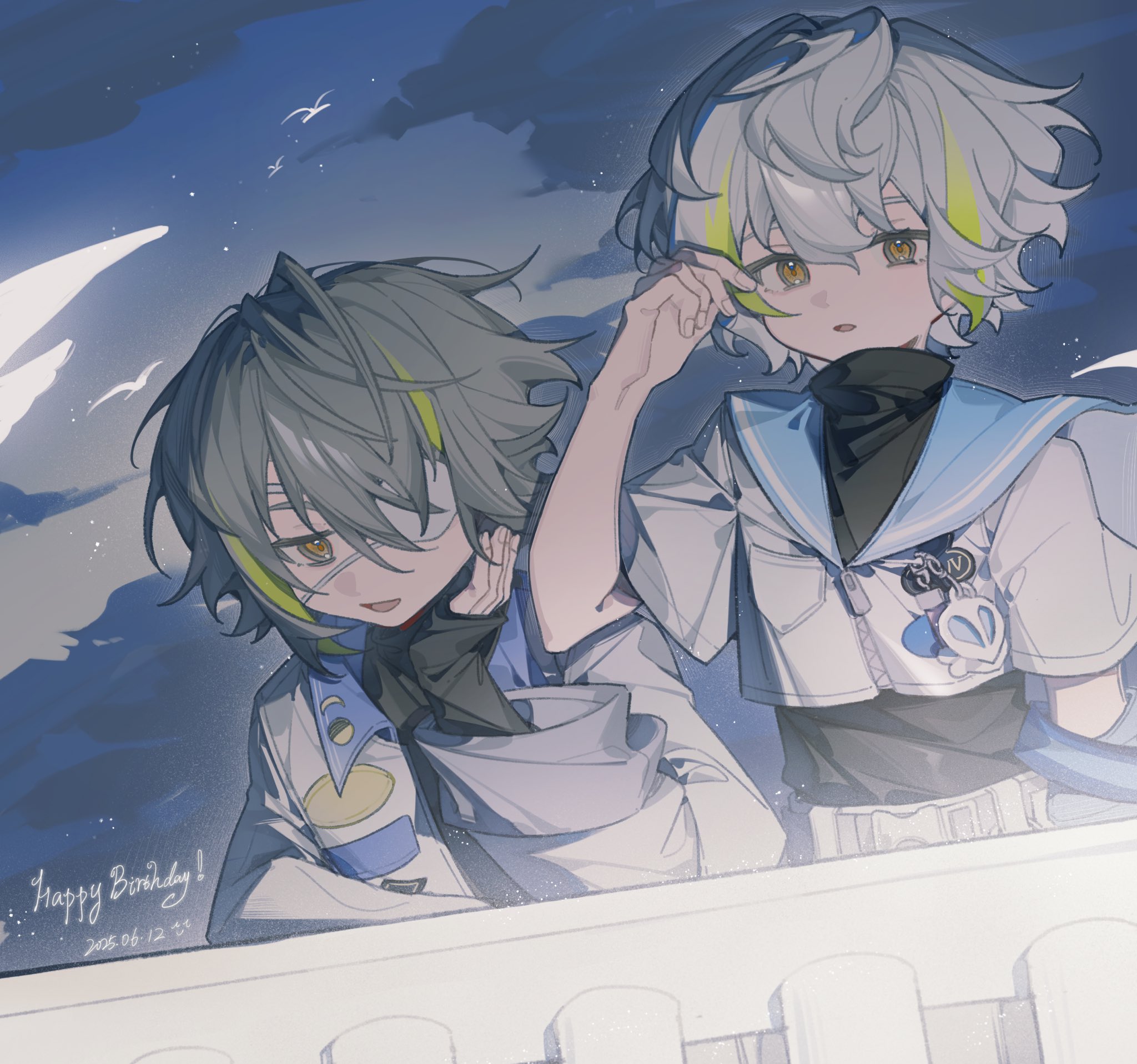 2boysblack shirtblonde hairbrown eyeseyepatchgrey hairjacketlong sleeveslooking at viewermale focusmulticolored hairmultiple boysnightnight skyopen mouthsailor collarshiramitsu ryuishiramitsu toishirtshort hairshort sleevesskystreaked hairturtleneckwhite hairwhite jacketyellow eyes