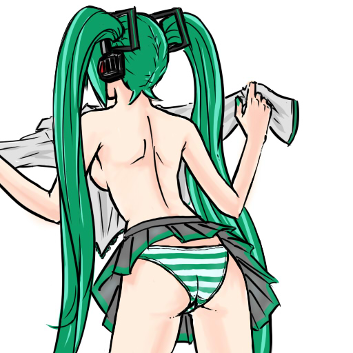 1girlbreastsfemale focusgreen hairlong hairpantiespantyshotsideboobskirtsolostriped clothesstriped pantiestopless femaletwintailsunderwearupskirtvery long hair