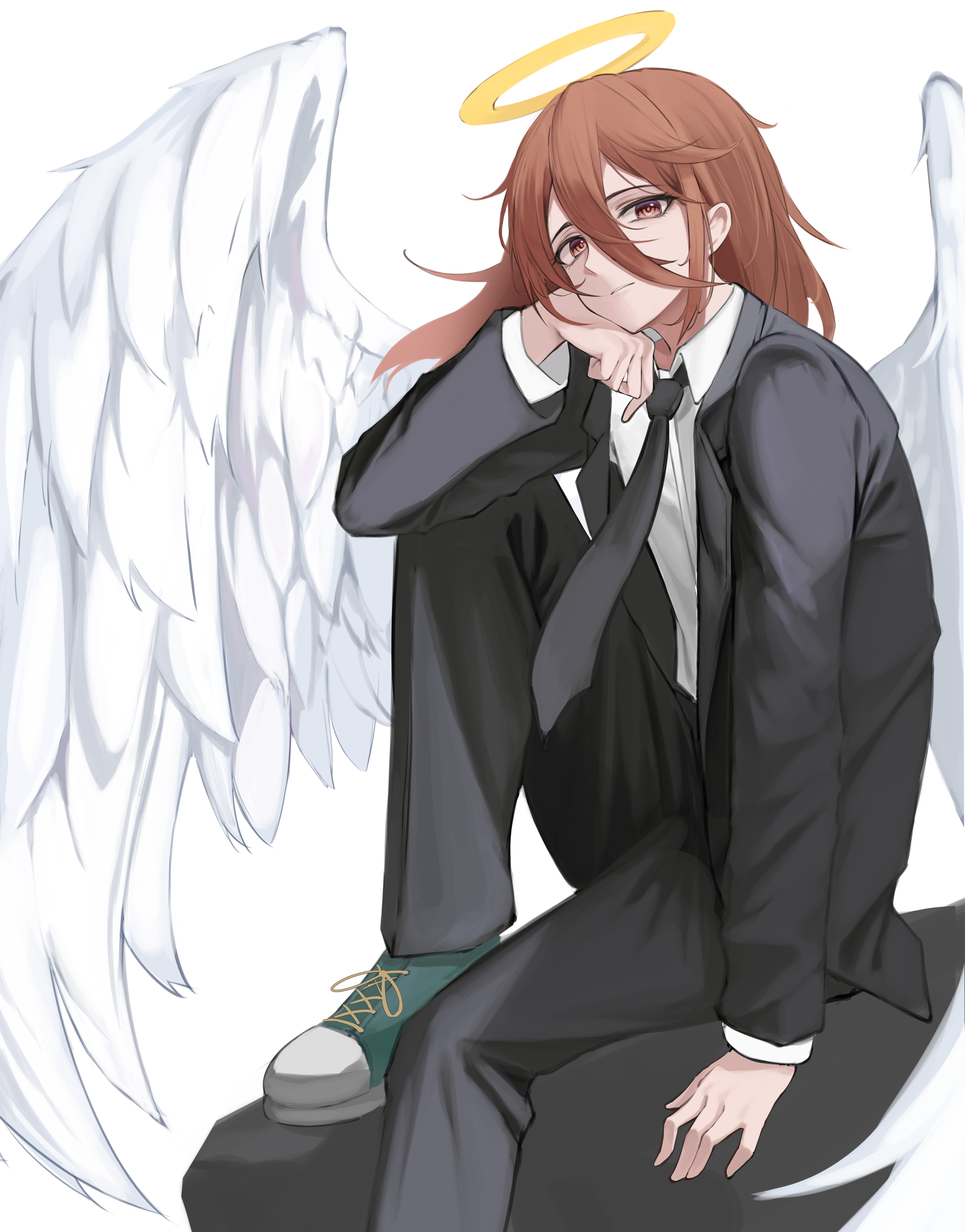 misaki nonaka, original, highres, 1girl, black hair, breasts, cleavage, collarbone, hair between eyes, multicolored hair, navel, red eyes, red hair, shadow, short hair, side ponytail, solo, stomach, streaked hair, sunburn, tan, tanline, twitter username, white background