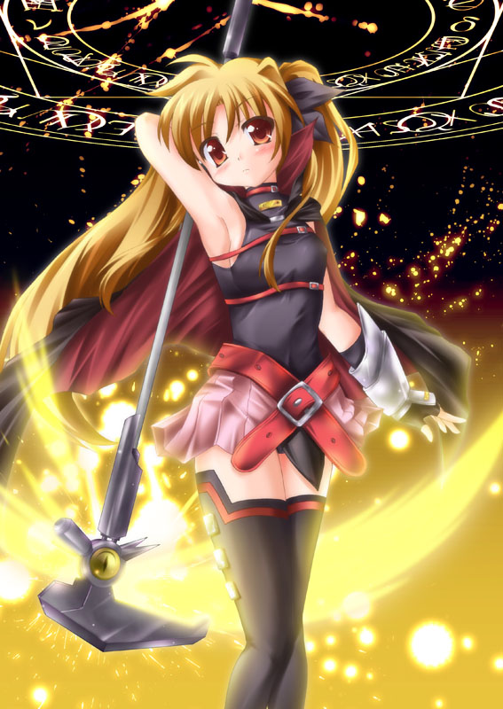 00s1girlblonde hairenergy bladefemale focuslong hairmagic circleoctagramred eyesribbonscythesolothighhighstwintailsvery long hairzettai ryouiki