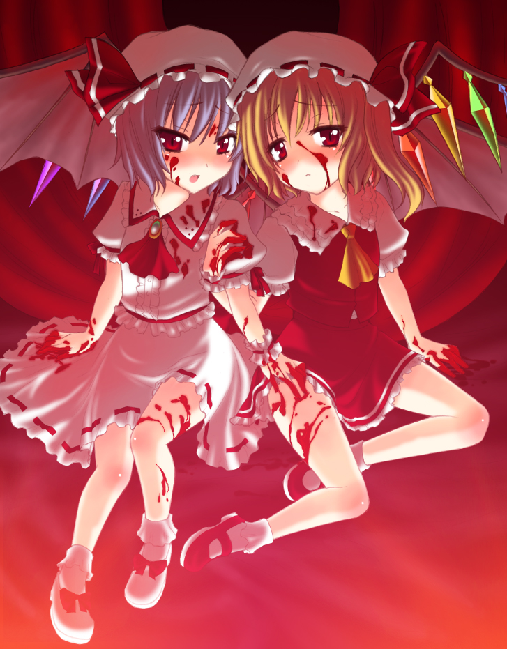 2girlsbloodblousecollared shirtfemale focusfrilled shirtfrillshatmob capmultiple girlsred backgroundred themeribbon trimribbon-trimmed skirtshirtsiblingssisterssockswhite shirt