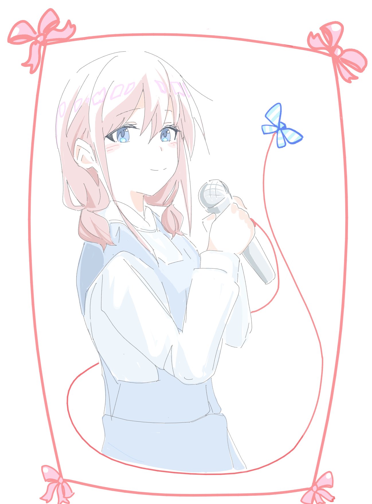 1girlblue eyesblue sweater vestblushbrown hairclosed mouthholdingholding microphoneinset borderlong hairlong sleeveslow twintailsmedium hairmicrophoneshirtshort twintailssimple backgroundsolostringstring of fatesweater vesttwintailswhite backgroundwhite shirt