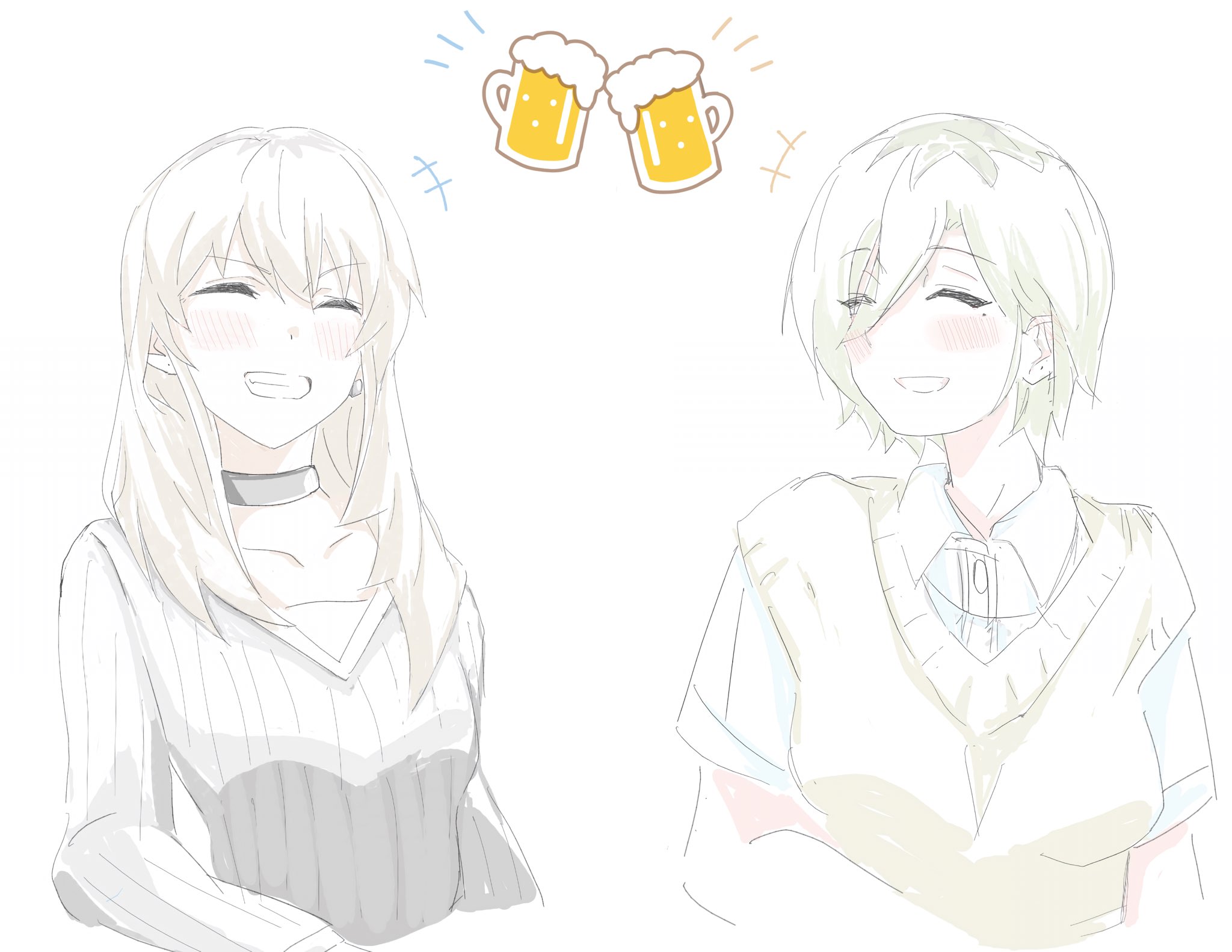 2girlsalcoholbeerblack chokerblack sweaterbrown sweater vestchokerclenched teethclosed eyescollared shirtdress shirtearringsgrey hairhair between eyesjewelrylong hairlong hair between eyesmulticolored hairmultiple girlspiercing holeroots (hair)shirtshort hairsimple backgroundsweatersweater vestteethupper bodywhite backgroundwhite shirt