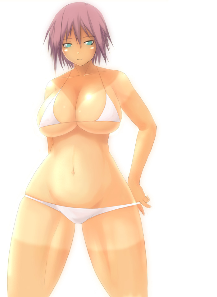 bikinibikini top onlyblushbreastscleavagecurvygreen eyeshuge breastsmidriffnavelpurple hairshort hairside-tie bikini bottomsmilesoloswimsuittantanline