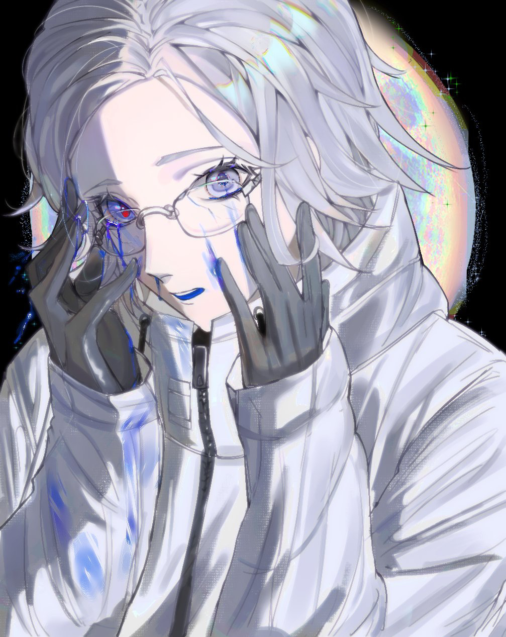 1boyblack glovesbloodblue bloodglassesglovesgrey hairhands upjacketlooking at viewermale focusmismatched pupilsopen mouthoutofsight otmpurple eyesred pupilsshort hairsoloteethupper bodyupper teeth onlywhite jacket