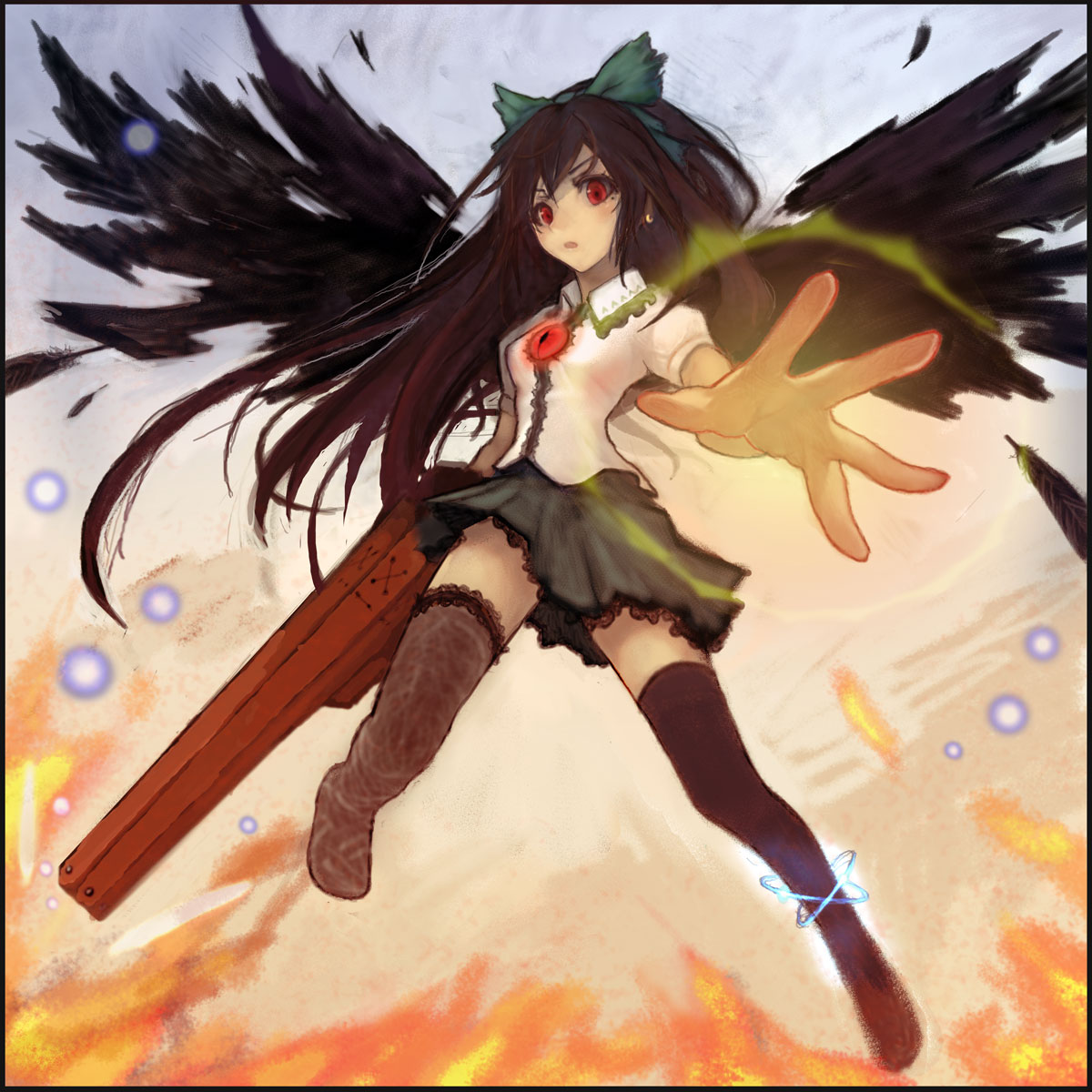 1girlblack hairborderdanmakuearringsfeathersfemale focusforeshorteningjewelrymadokansuzukioutstretched handred eyesskirtsolothighhighswings
