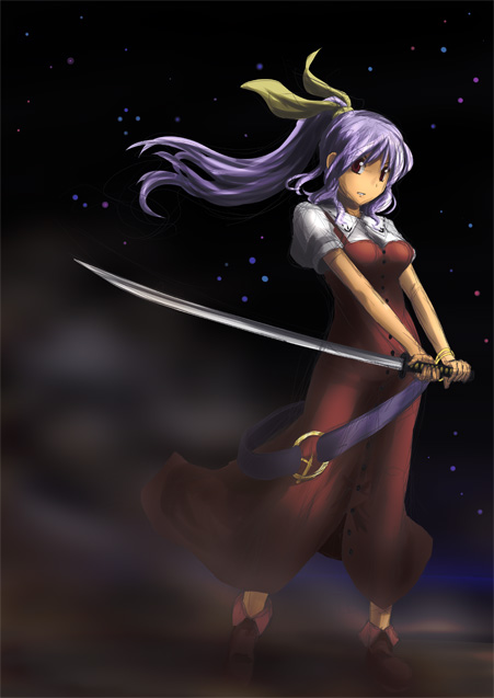1girlbeltbootsbowbraceletfemale focushair bowhigh ponytailjewelrykatanalong hairponytailpurple hairribbonsolostar (sky)swordweapon