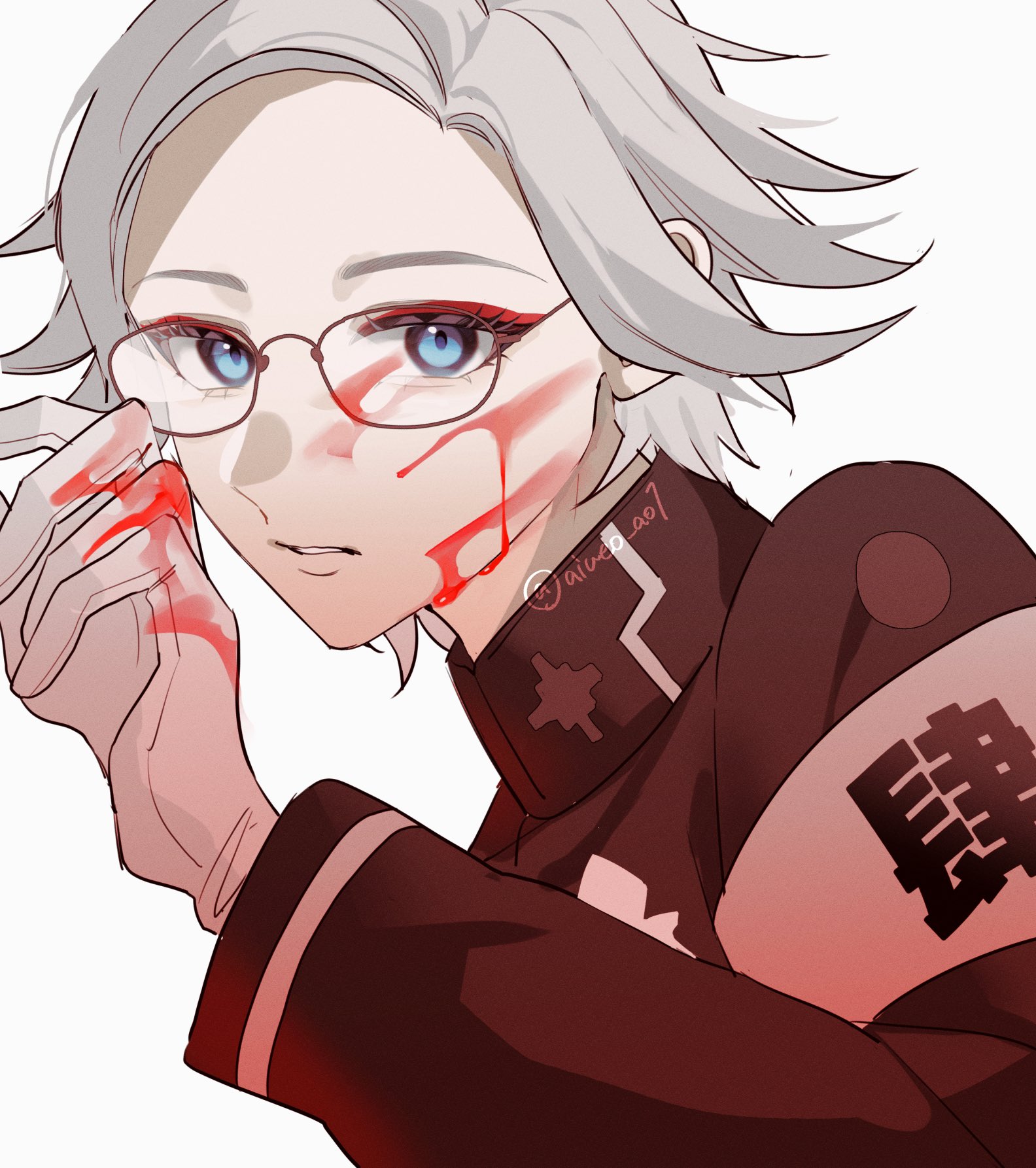 1boyaiueo ao1armbandblack jacketbloodblood on faceblue eyeseyelinergakuranglassesglovesgrey hairjacketlast defense academy school uniformlooking at viewermakeupmale focusparted lipsred eyelinerschool uniformshort hairsimple backgroundsolotwitter usernameupper bodywhite armbandwhite backgroundwhite gloves