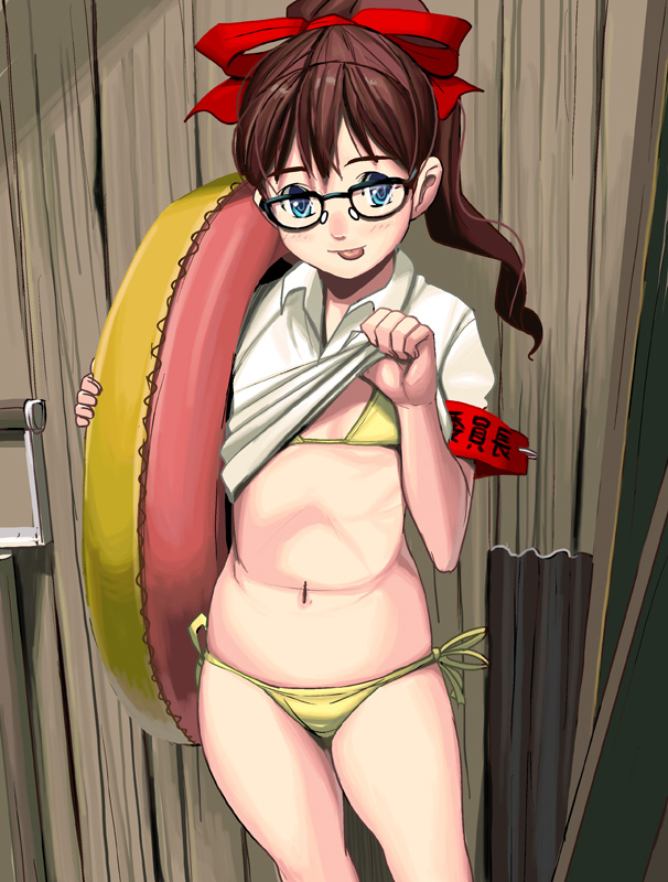 :p1girlarmbandbikiniblue eyesbrown hairclothes liftfemale focusflat chestglasseshair ribboninnertubelong hairponytailribbonshirt liftside-tie bikini bottomsoloswim ringswimsuittonguetongue outyellow bikini
