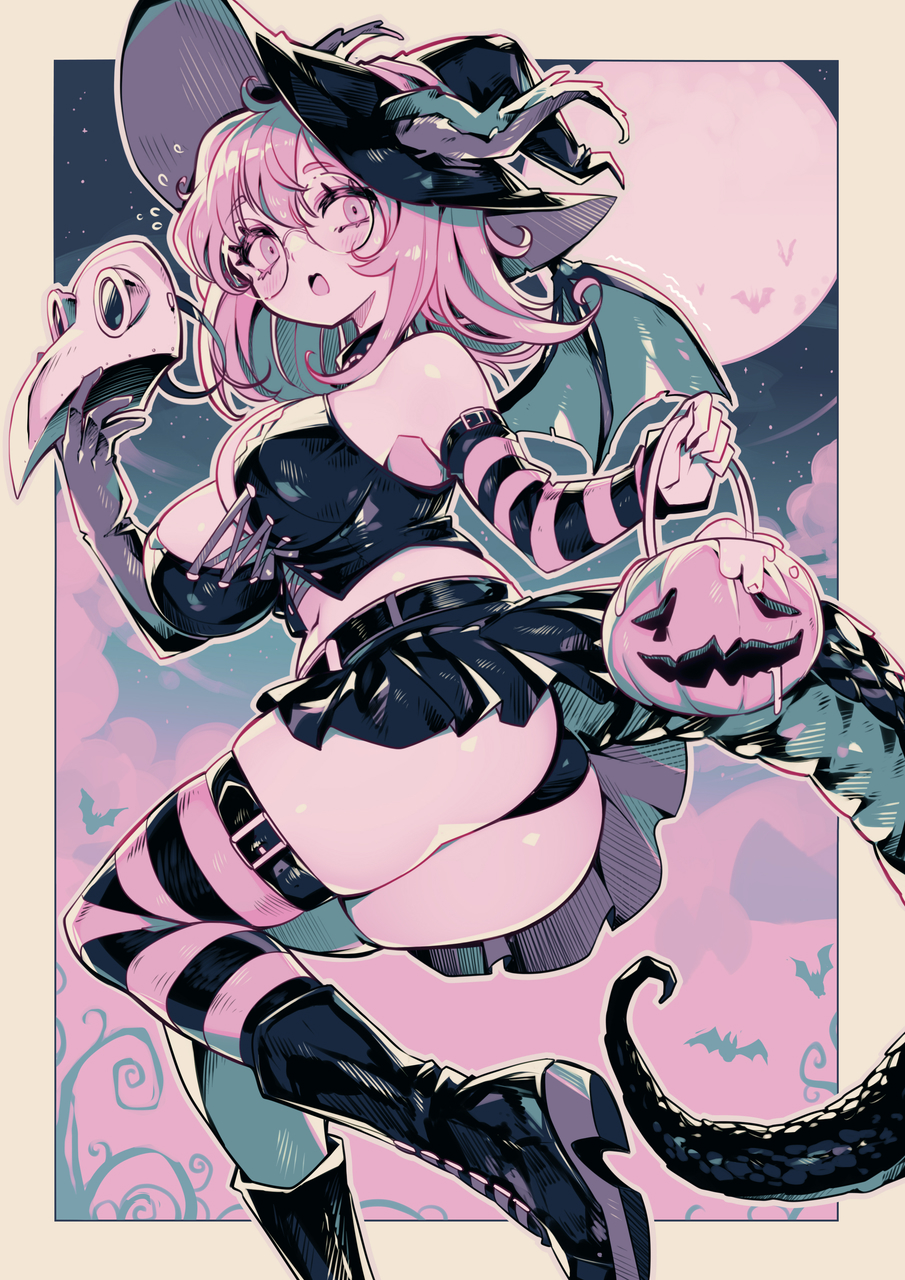 1girlassbare shouldersblack pantiesblack skirtbootsbreastsdetached sleevesdragon girldragon taildragon wingsfull bodyhalloween buckethatholdingholding masklarge breastslooking at viewermaskmedium hairmidriffminiskirtnavelopen mouthoutside borderpantiespantyshotpink themeplague doctor maskpleated skirtround eyewearsemi-rimless eyewearskirtsolostriped clothesstriped sleevesstriped thighhighstailthighhighsunderwearwingswitch hat