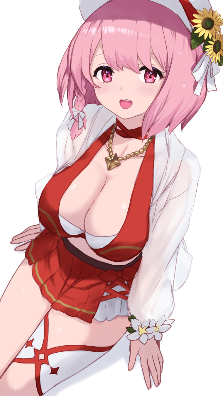 :d1girlbikinibreastscleavagecollarboneflowerfrom abovehathat flowerjewelrylarge breastslong sleeveslooking at viewerlooking upopen mouthpendantpink hairpuffy long sleevespuffy sleevespurple eyesred bikinishadowsimple backgroundsittingsmilesolosunflowerswimsuitwhite backgroundwhite flowerwhite hatyellow flower