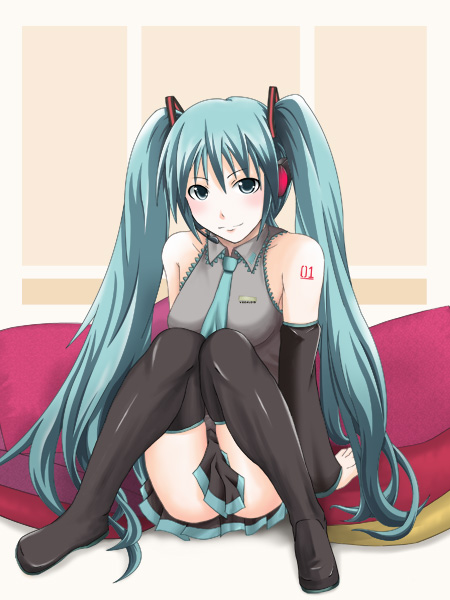 1girlaqua eyesaqua hairblushdetached sleevesfemale focusheadsetlong hairnecktiesittingskirtsolothighhighstwintails