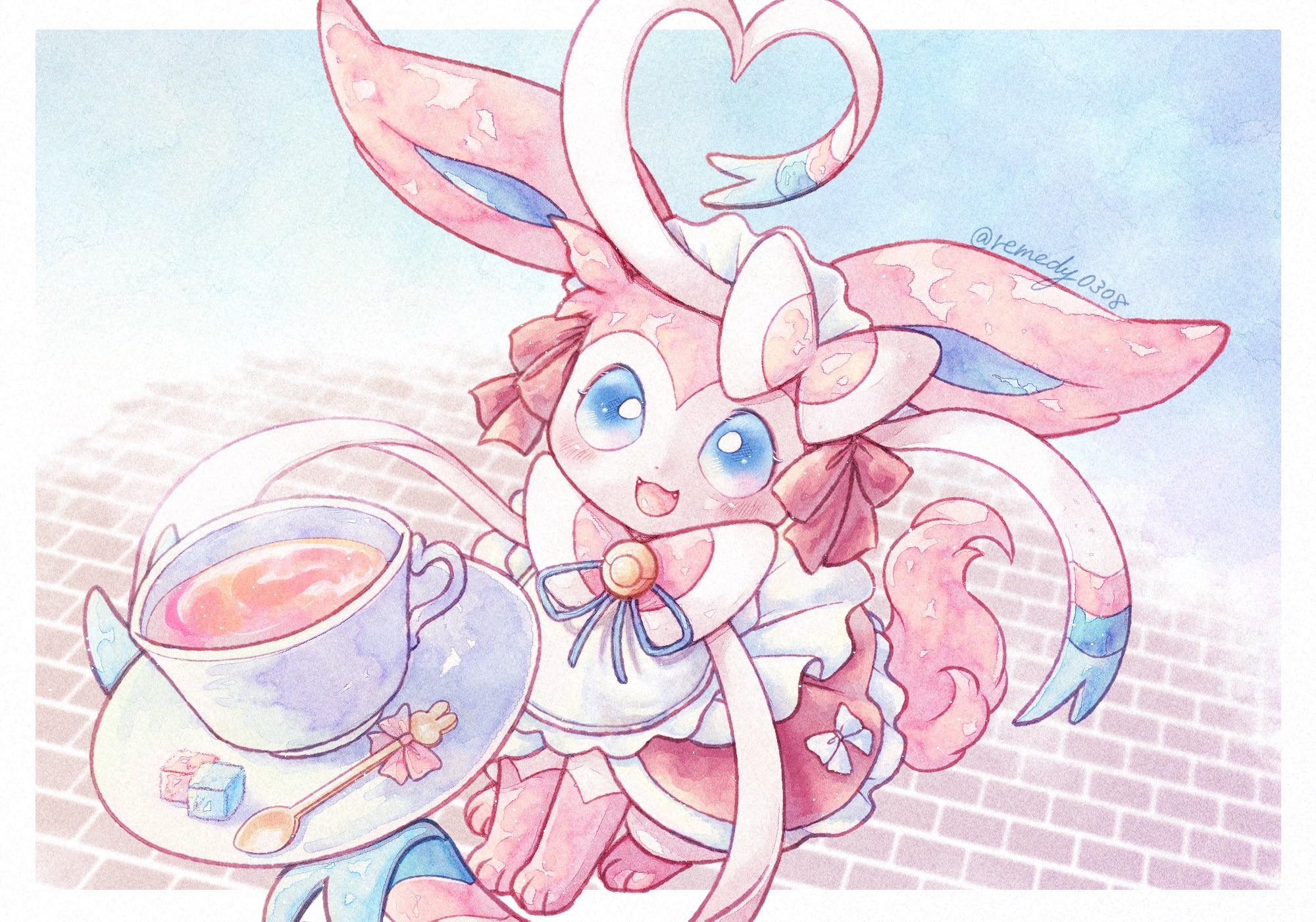 :danimal focusanimal handsapronblue backgroundblue eyesblue ribbonborderbowclothed pokemoncupdressfrilled dressfrillsfull bodygen 6 pokemonhair bowlooking at viewermaid headdressno humansopen mouthpink bowpink dresspink furpokemon (creature)pokemon focusribbonsimple backgroundsittingsmilesolosugar cubeteacuptwo-tone furwhite apronwhite borderwhite fur
