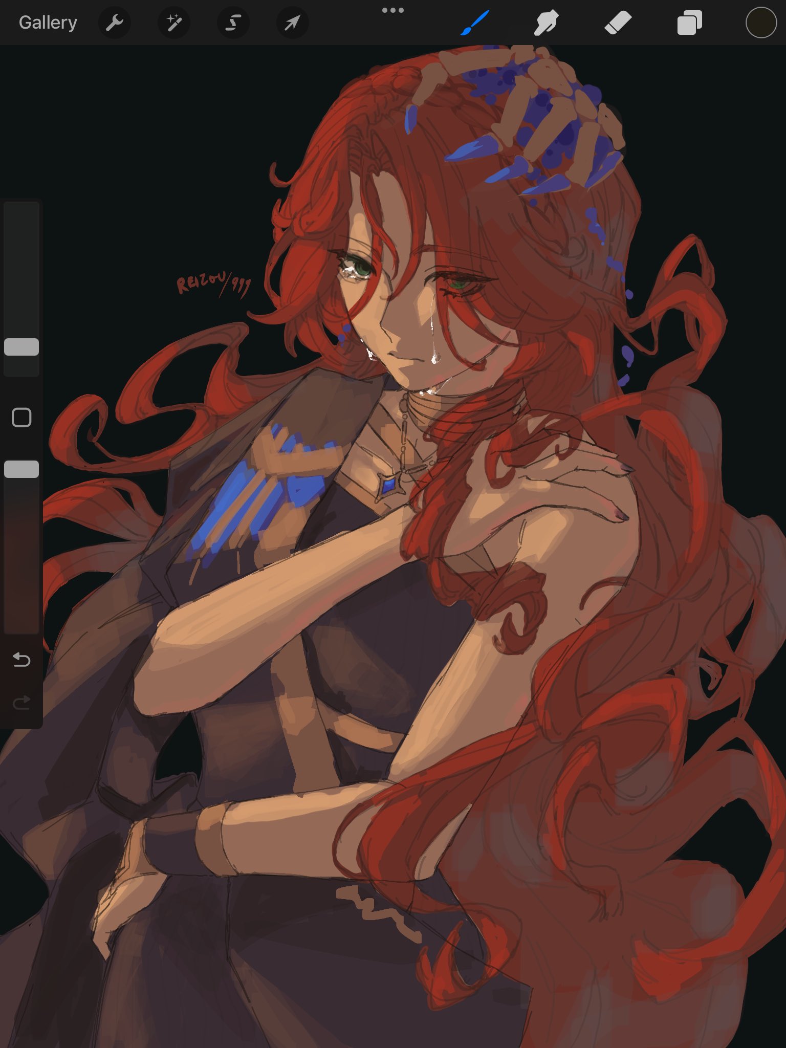 1girlart program in frameblack backgroundblack dressblue gemstoneclosed mouthcryingcrying with eyes opendresseyes visible through hairgemgold chokergreen eyeshair ornamenthair over one eyehand on own shoulderjewelrylong hairpendantred hairsingle bare shouldersolostreaming tearstearsupper bodyvery long hair