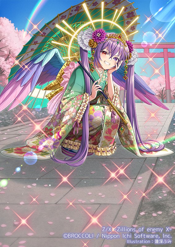 1girlaqua wingscherry blossomsclenched teethcopyright noticefeathered wingsfloral printfloral print kimonoflowergreen umbrellahair flowerhair ornamenthand on own chinheterochromiaholdingholding umbrellajapanese clotheskalavinka (z/x)kimonolong hairlooking at viewermulticolored wingsoutdoorspink wingsprint kimonopurple eyespurple hairpurple wingsrainbowred eyessmilesolosparklesquattingteethtoriitwintailsumbrellawings