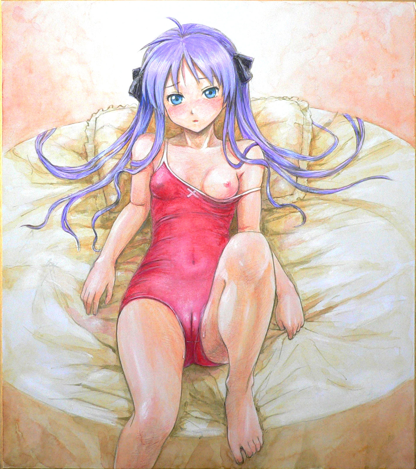 00s1girlbarefootblue eyesblushbreastscameltoefeetfemale focuslong hairnipplesone-piece swimsuitpillowpurple hairsmall breastssolostrap slipswimsuittwintails