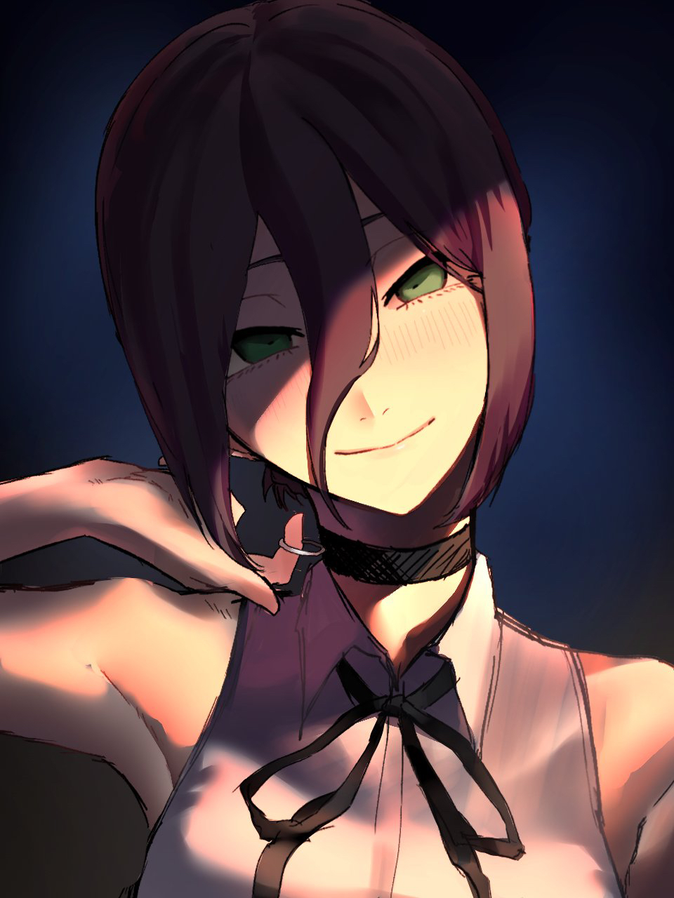 1girlblack chokerblack ribbonchokerclosed mouthcollared shirtgreen eyesgrenade pingrey shirthair between eyeslooking at viewerneck ribbonpurple hairribbonshirtsleevelesssleeveless shirtsmilesolo
