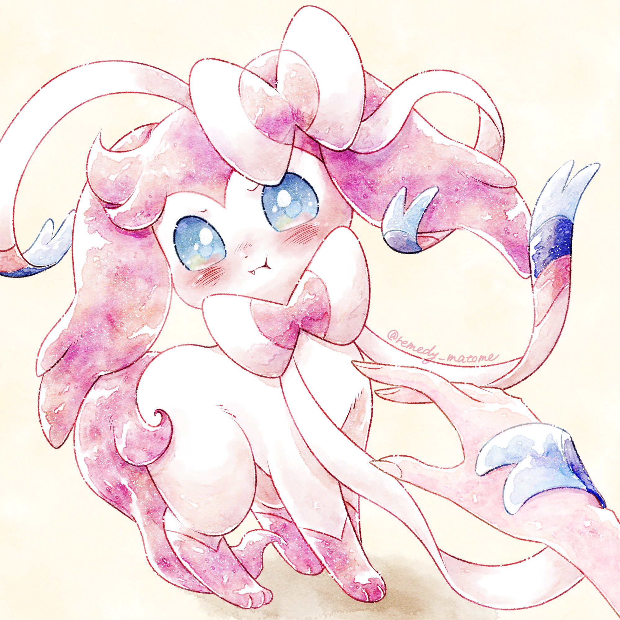 animal focusanimal handsblue eyesblushbowclosed mouthdisembodied handears downfangfull bodygen 6 pokemonlooking at viewerno humanspink furpokemon (creature)pokemon focuspoutribbonsimple backgroundsolostandingtwo-tone furwhite furyellow background