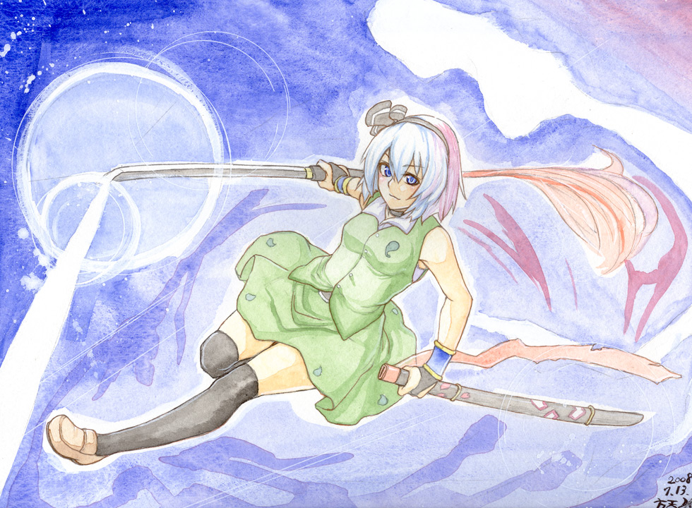 1girlblack thighhighsblue eyesdatedfemale focushairbandkatanaloafersshoesshort hairsoloswordthighhighsweapon