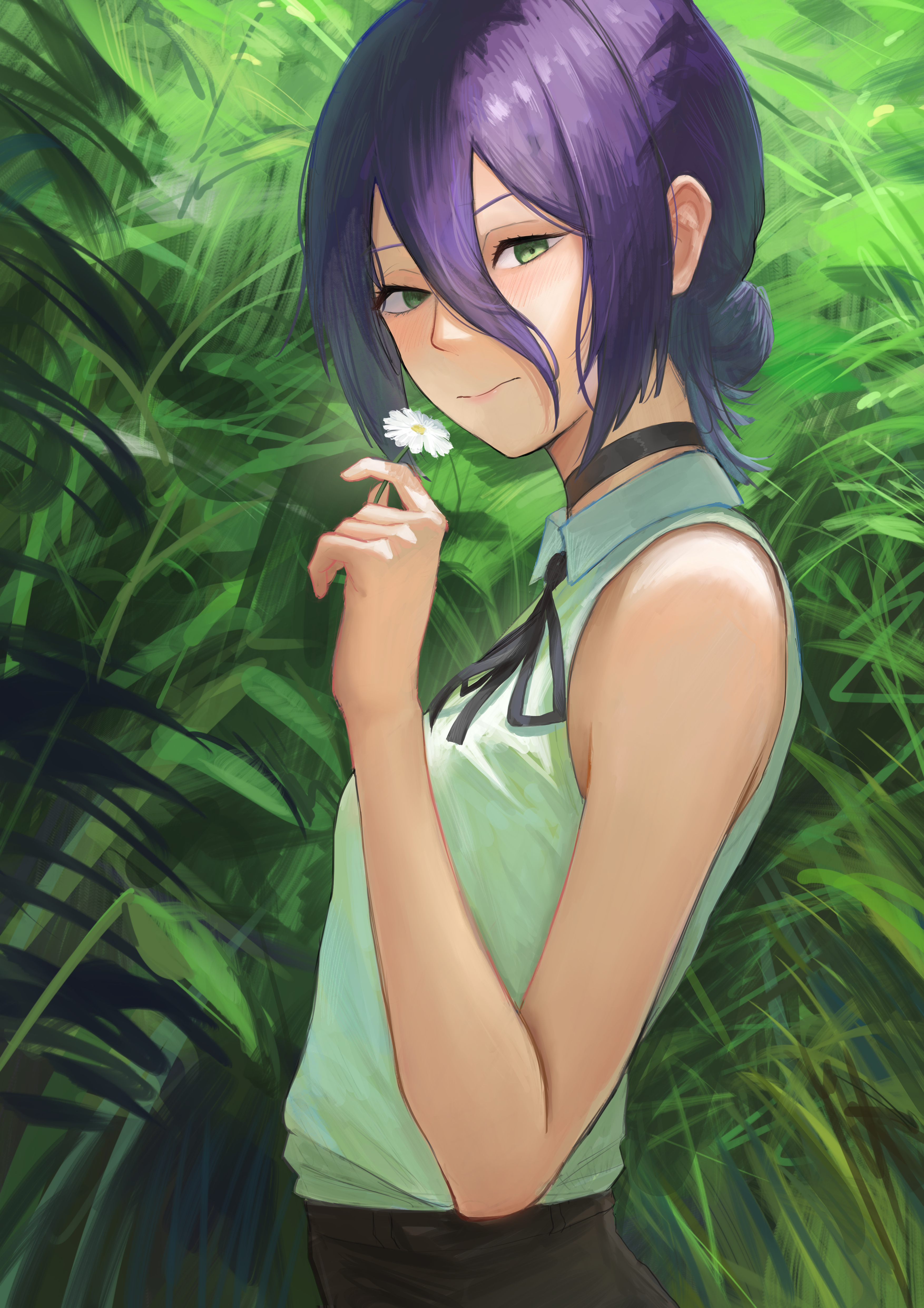1girlblack chokerblack ribbonchokerclosed mouthcollared shirtflowergreen eyeshair between eyeshair bunholdingholding flowerlooking at viewerneck ribbonpurple hairribbonshirtshirt tucked insleevelesssleeveless shirtsolowhite flowerwhite shirt