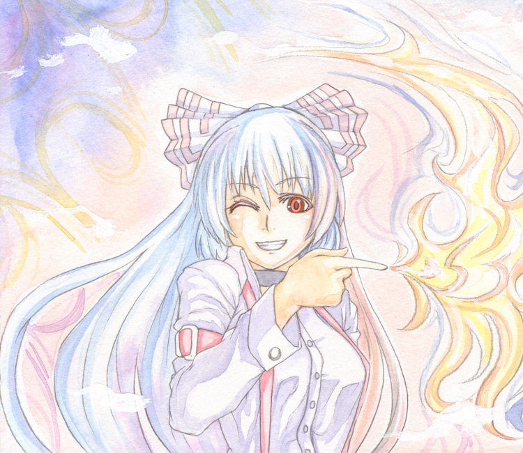 1girlblue hairchokerfemale focusfiregrinlong hairone eye closedred eyessmilesolosuspenderswink