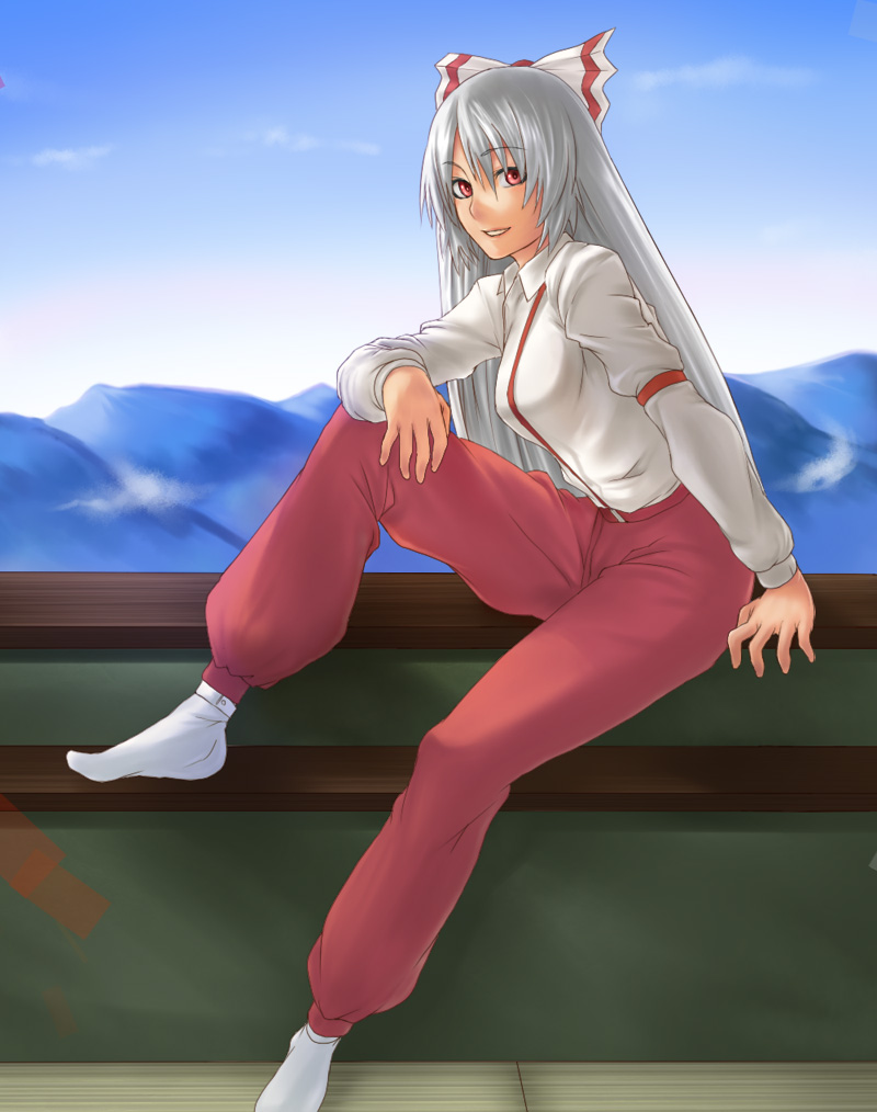 1girlcloudfemale focuslong hairoutdoorspantsred eyessittingskysockssolospread legssuspenderswhite hair