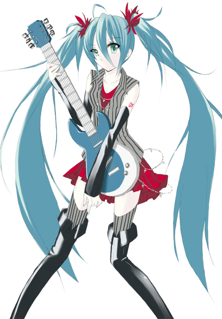 1girlaqua hairdetached sleevesfemale focusgreen eyesguitarinstrumentlong hairskirtsolothighhighstwintails