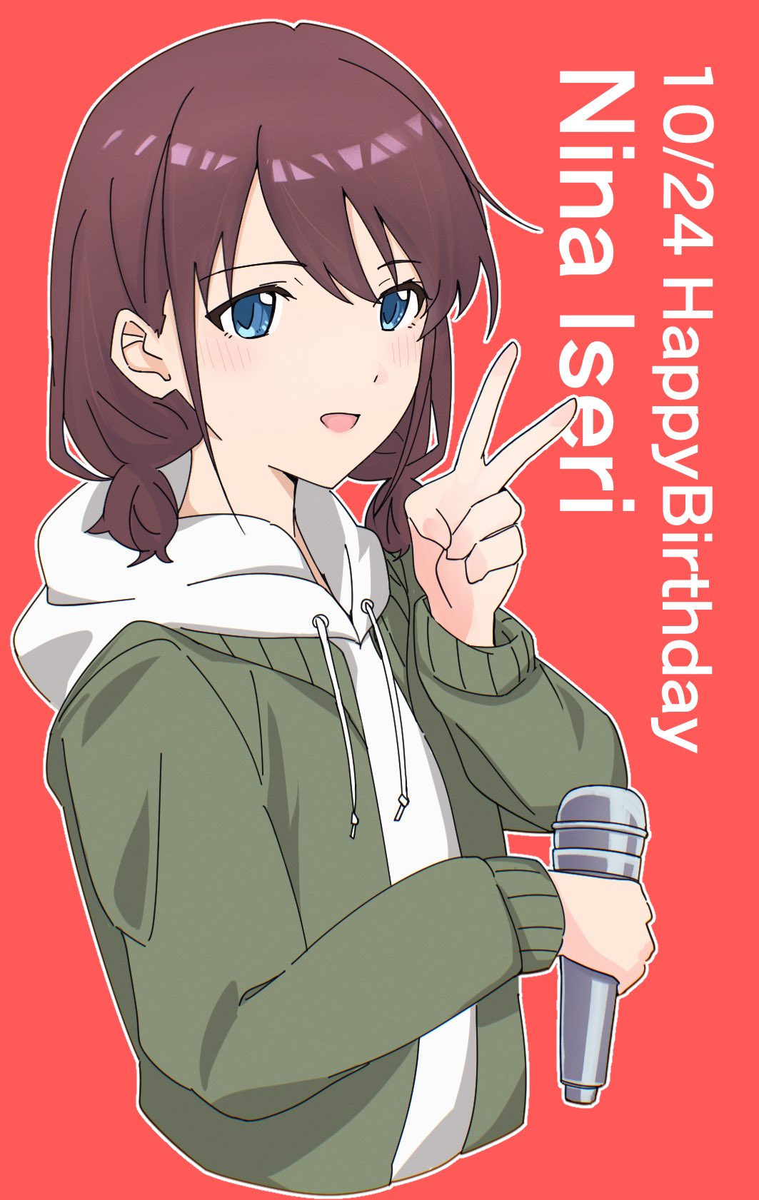 1girlblue eyesblushbrown haircharacter namedatedgreen jackethappy birthdayholdingholding microphonehoodhood downhoodiejacketlong sleeveslooking at viewerlow twintailsmicrophoneopen mouthred backgroundred eyesshort hairshort twintailssimple backgroundsolotwintailsupper bodyvwhite hoodie
