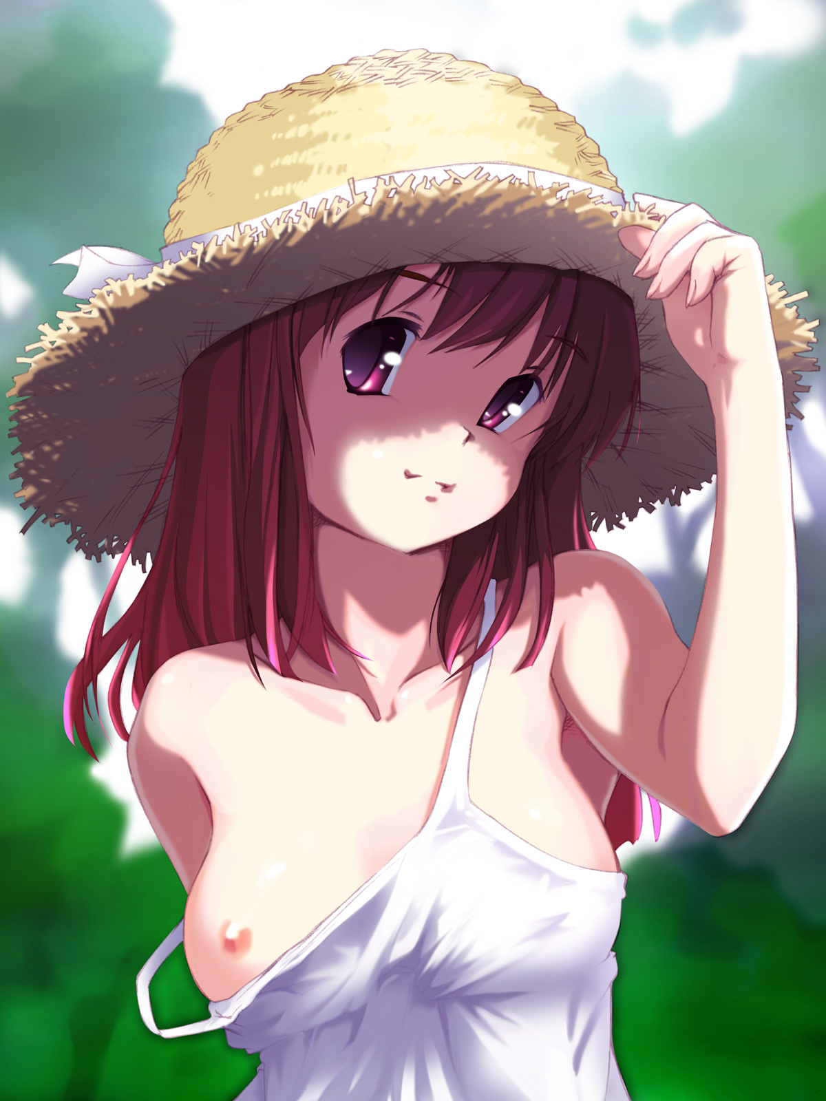 1girlbreast slipbreastsbrown hairfemale focushatlong hairnipplesone breast outpink eyesred hairsmall breastssmilesolostrap slipstraw hat