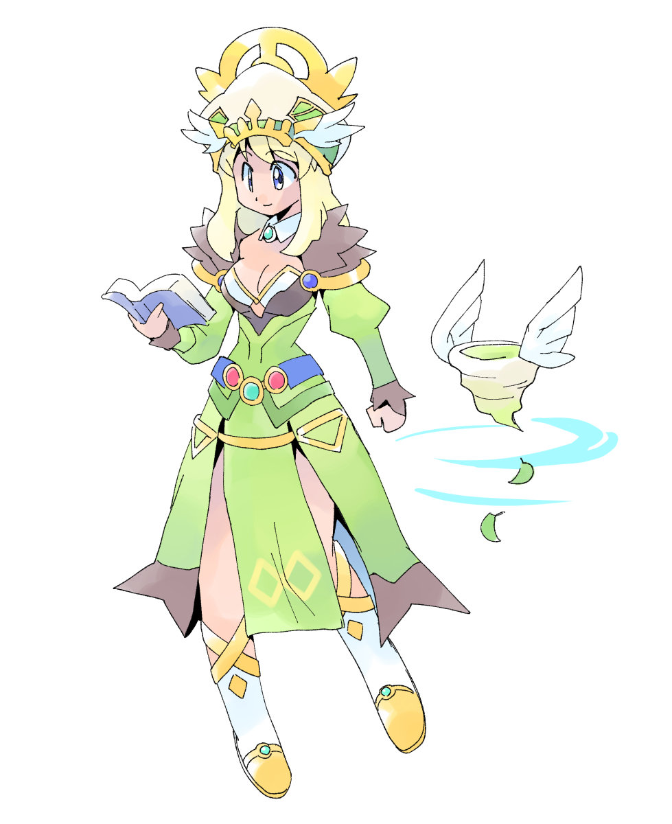 1girlbeltblonde hairblue beltbookbootsbreastsbroochcleavageclosed mouthcollardetached collardresselemental master (ragnarok online)full bodyfur trimfur-trimmed dressgreen dressgrey eyeshalohatholdingholding bookjewelrylong hairlong sleevesmedium breastspelvic curtainreadingsimple backgroundsmilesolostandingwhirlwindwhite backgroundwhite bootswhite collarwhite hatyellow halo
