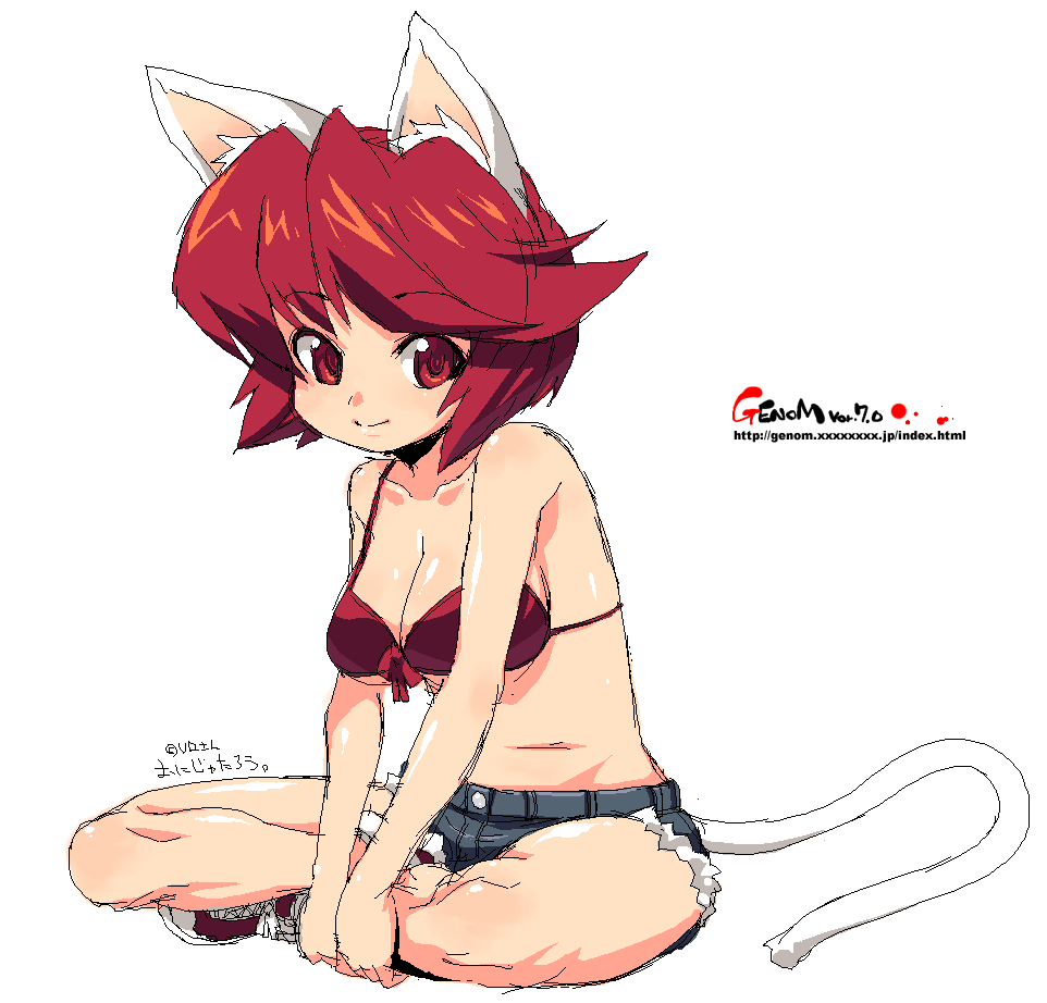 1girlanimal earsbikinibikini top onlyborrowed charactercat earscat taildenimdenim shortsfemale focusoekakired bikinired eyesred hairshoesshort hairshortssittingsneakerssoloswimsuittail