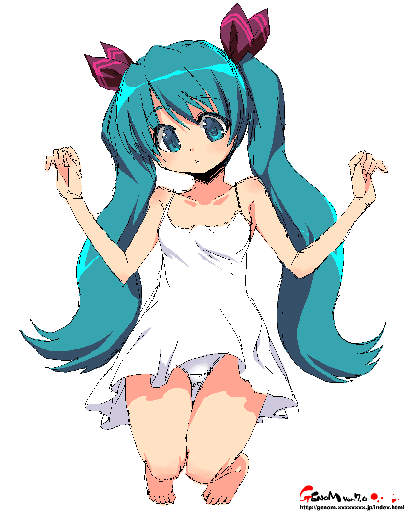 aqua hairblue eyesdressflat chesthair ribbonjumpinglong hairoekakipantiespantyshotribbonshort dresssolotwintailsunderwear