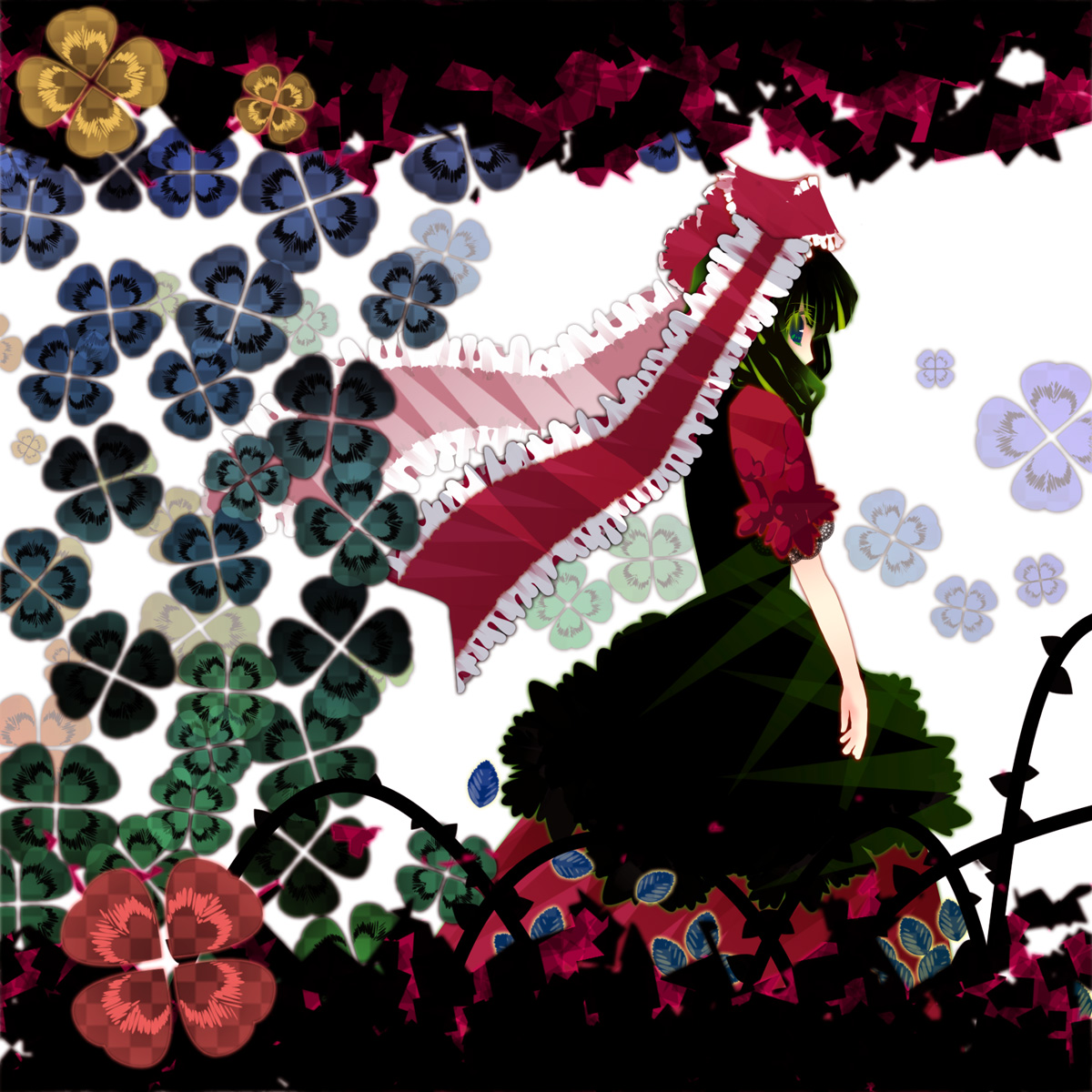 shirami souko, len'en, highres, 1other, androgynous, blue sky, bow, bowtie, brown kimono, closed mouth, cloud, compass (xinjinjumin6687443), day, expressionless, flower, green bow, green bowtie, holding, holding flower, holding staff, japanese clothes, kimono, long hair, long sidelocks, long sleeves, no headwear, ofuda, other focus, outdoors, pink flower, purple eyes, purple hair, see-through clothes, sidelocks, sky, solo, staff, tsurime, upper body, very long hair, wide sleeves