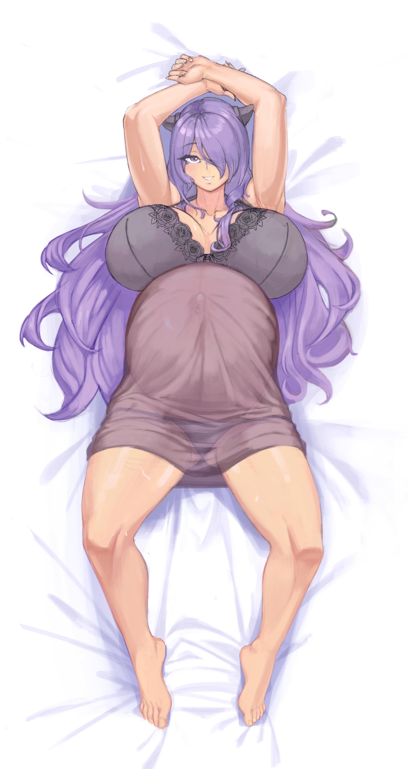 1girlarms upbabydollblushbrabreastscollarbonecurvyfake hornshair over one eyehair over shoulderhorned headwearlacelace bralarge breastslong hairlooking at viewerlyingon backon bedoutie navelpantiesparted lipspregnantpurple eyespurple hairsee-through clothesshiny skinsidelockssmilesolothick thighsthighsunderwearvery long hairwavy hairwide hips