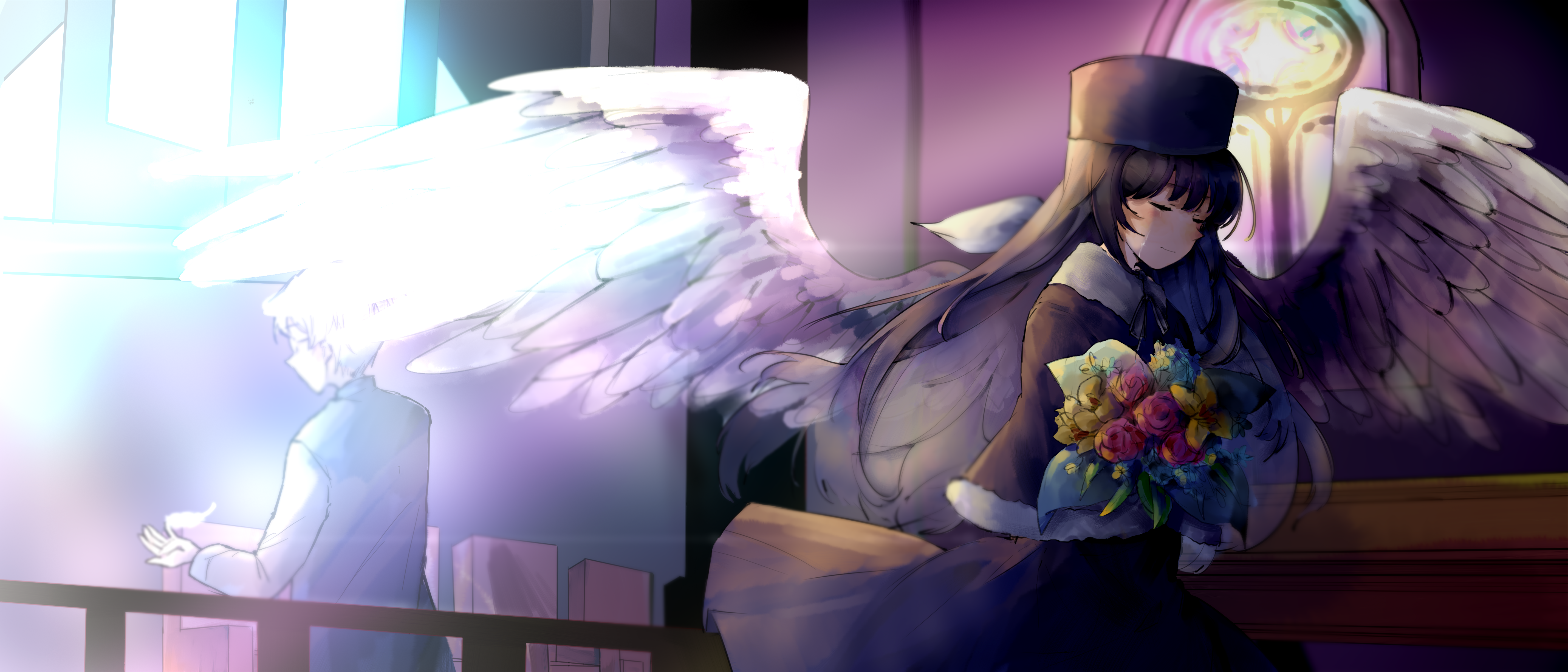 chitanda eru, hyouka, highres, 1girl, bag, black hair, blue skirt, blush, closed mouth, english text, junyongkim9, kamiyama high school uniform (hyouka), long hair, long sleeves, looking at viewer, neckerchief, no shoes, pleated skirt, purple eyes, red scarf, sailor collar, scarf, school bag, school uniform, serafuku, shirt, skirt, solo, squatting, thighhighs, white shirt