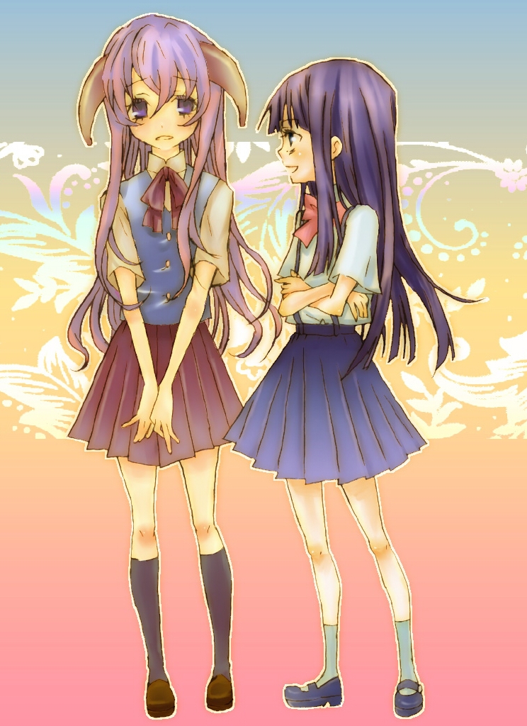 :d00s2girlsblue hairblushfull bodyhornskneehighslooking at viewermary janesmultiple girlsopen mouthown hands togetherpleated skirtpurple eyespurple hairschool uniformserafukushoesskirtsmilesocksstandingv arms