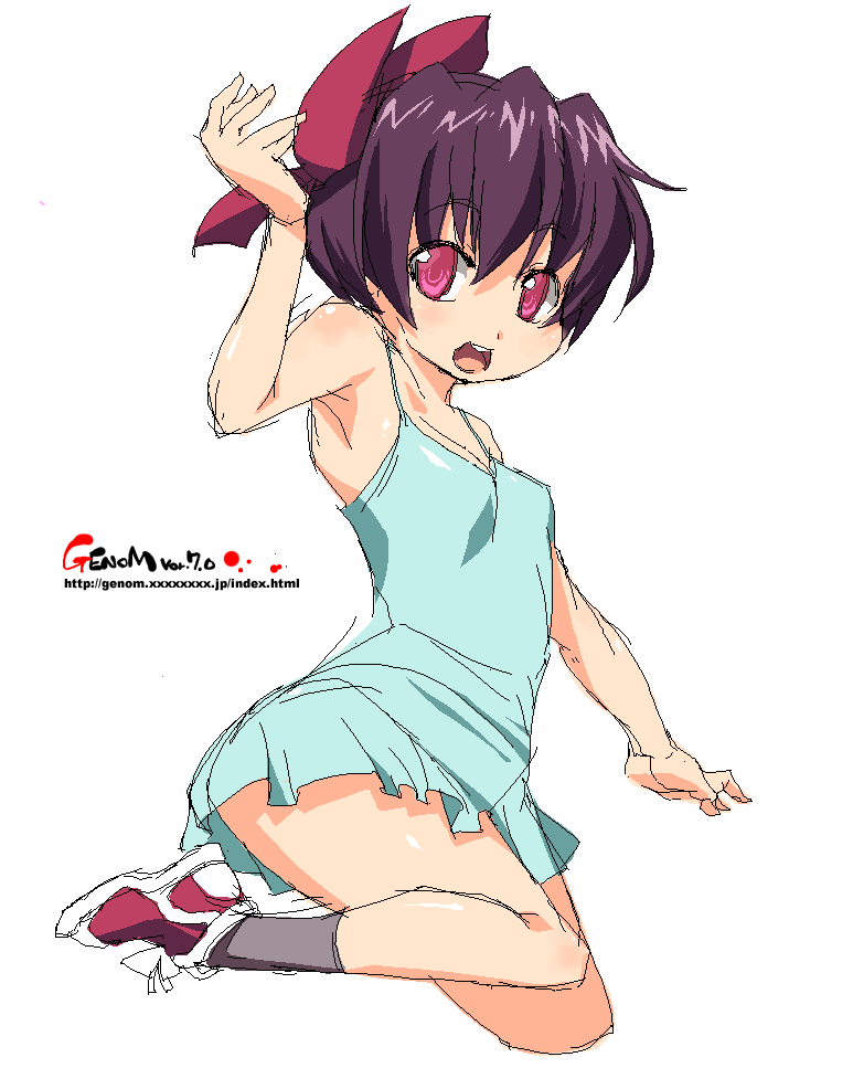 bowdressflat chesthair bowoekakiopen mouthpink eyespurple hairshoesshort dressshort hairsmilesneakerssockssolo